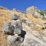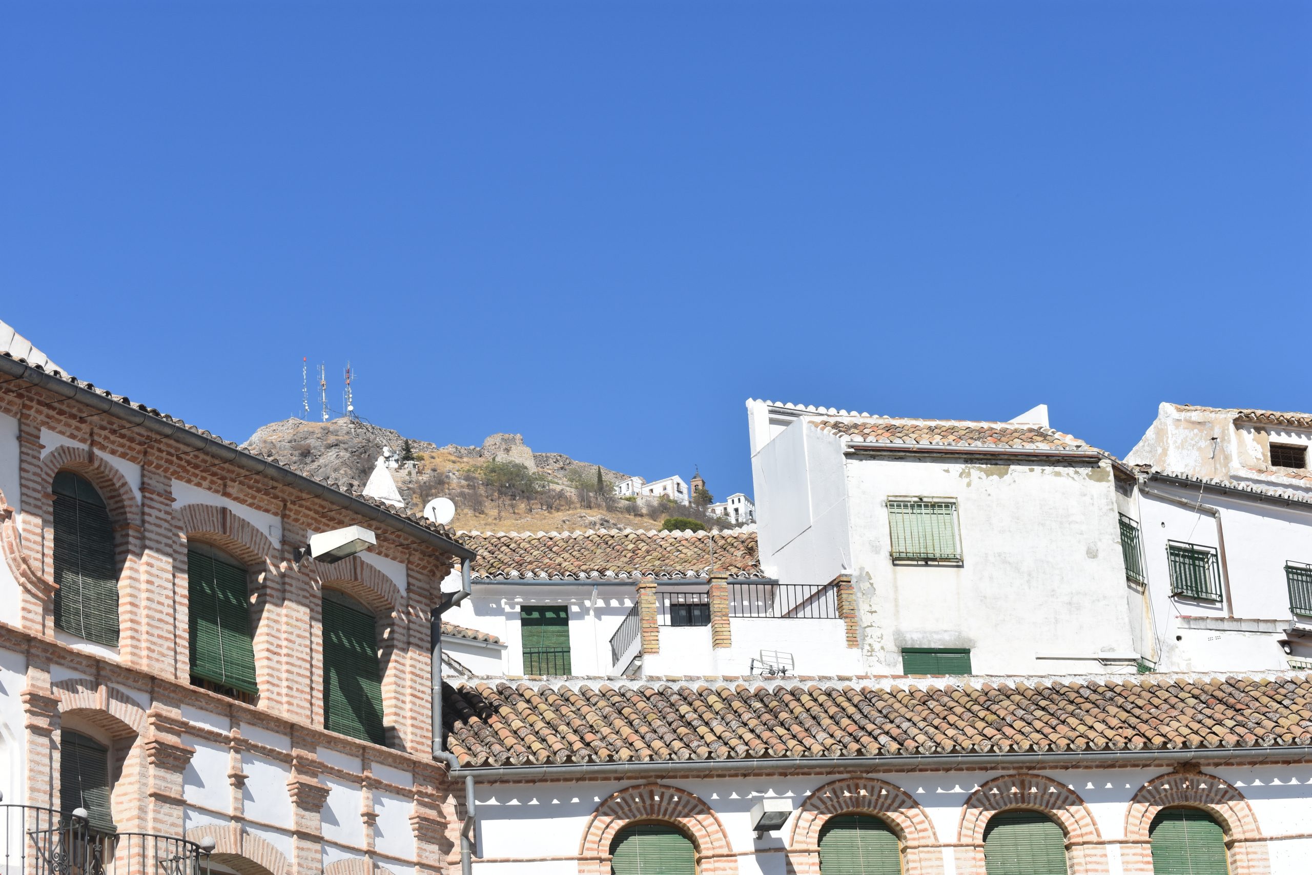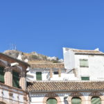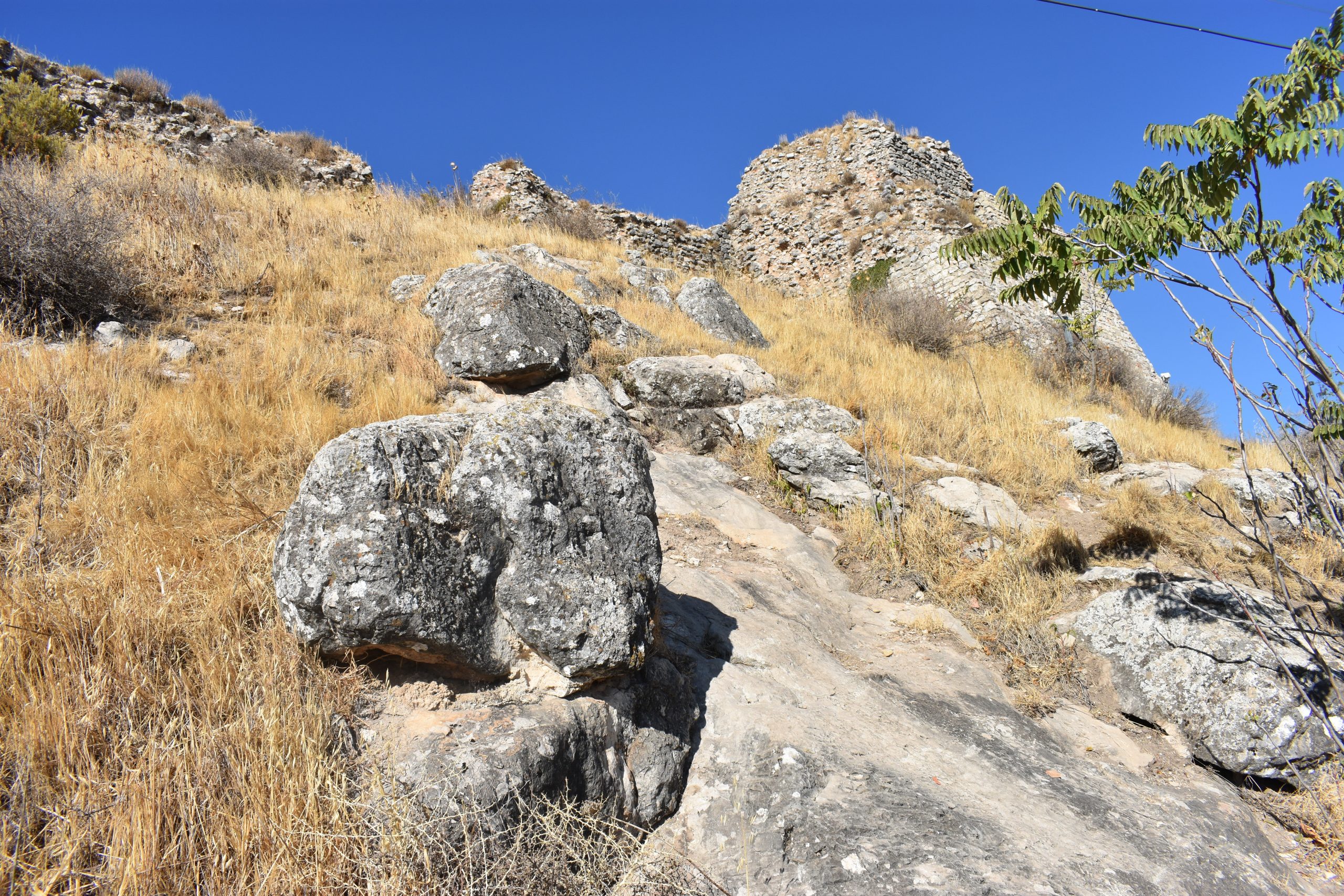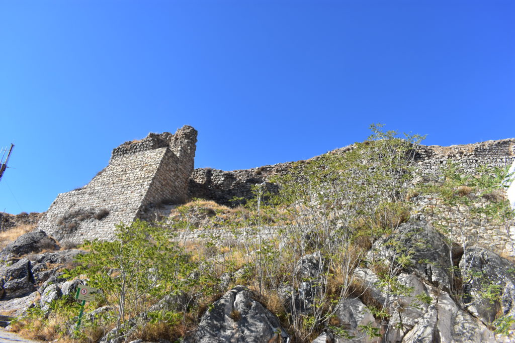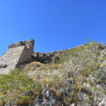En lo alto, junto al Santuario. En ruinas, queda la muralla y algunas ruinas en lo alto.