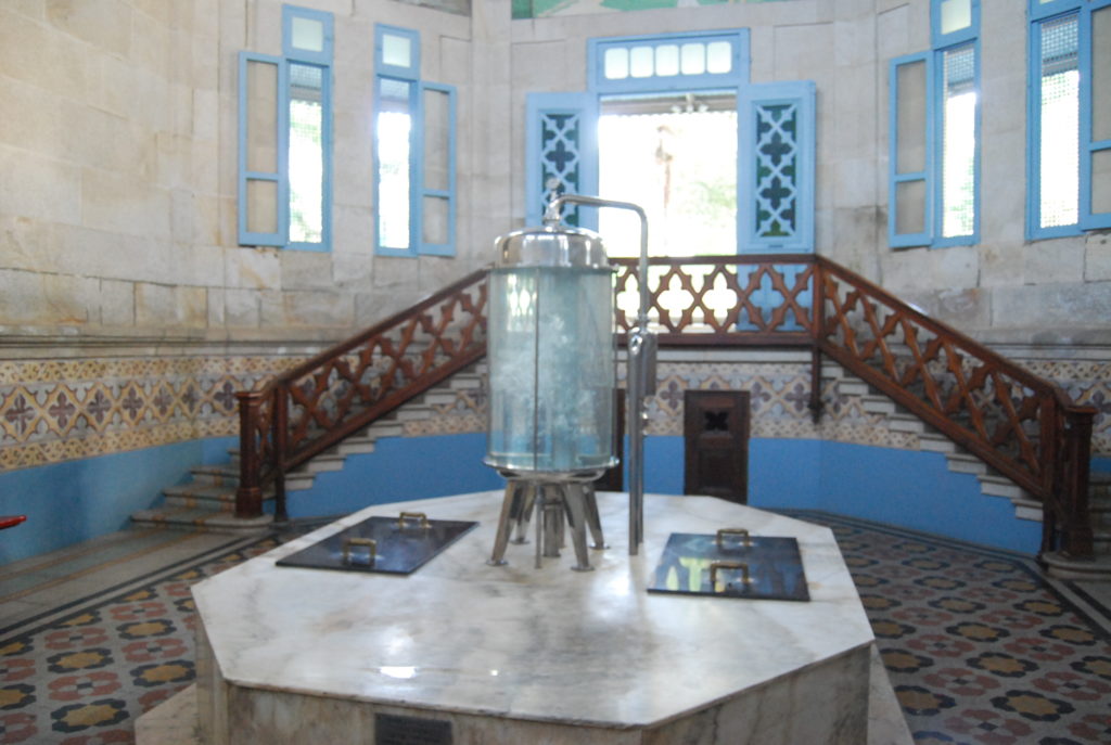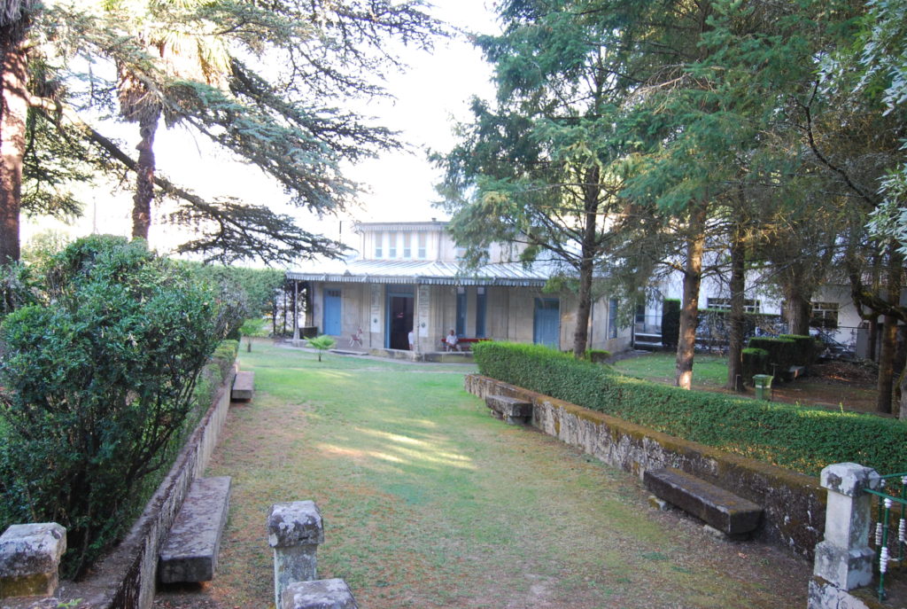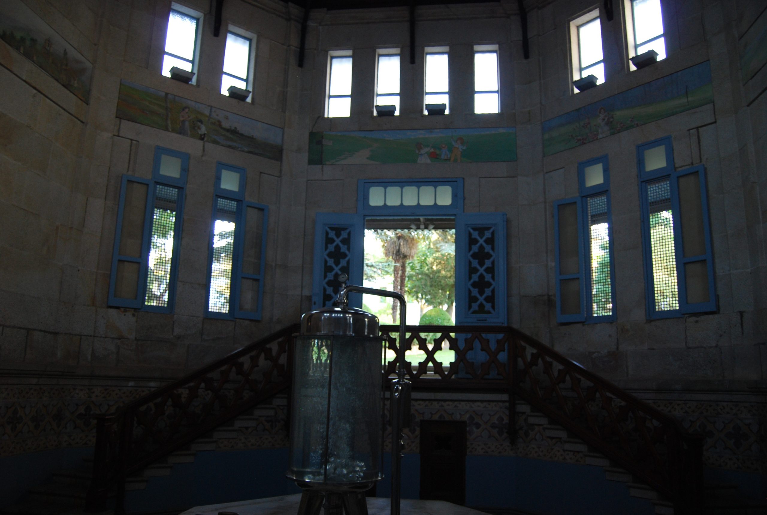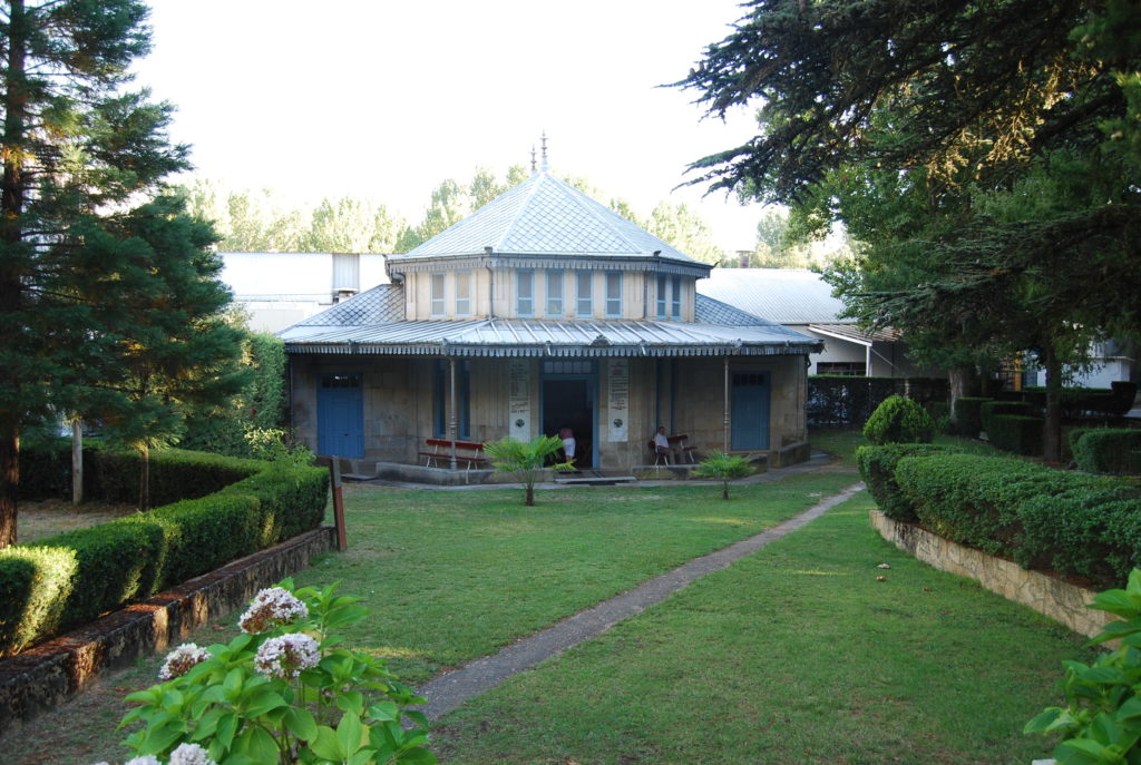 Un pequeño parque con el antiguo hotel del balneario cerrado desde los años 60. En el parque se señalan los árboles y encontramos el templete de los aguadores de donde se puede beber gratuitamente el agua termal del manantial. Destaca el templete con sus frescos. Esta agua del manantial se comercializa ahora en botella negra como magma.