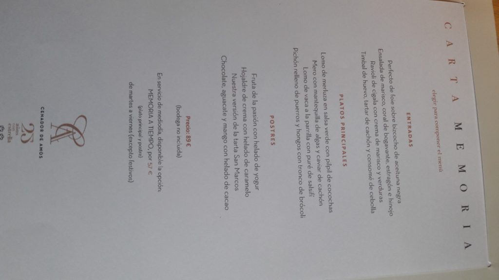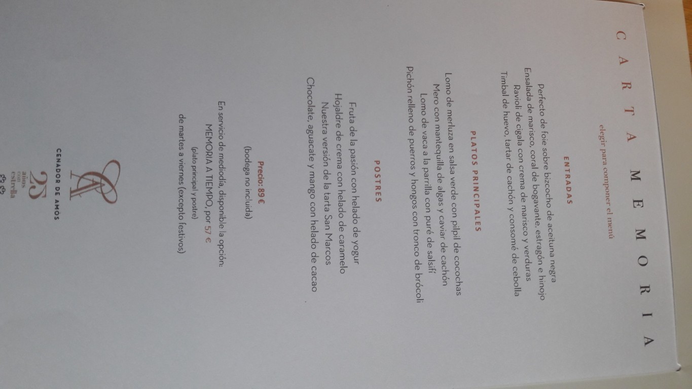 Más que una comida lo han convertido en una experiencia. Al llegar nos invitaron a un aperitivo; fantásticas anchoas sobadas en la casa y un rosado y acto seguido te muestran el Palacio con la pequeña panadería y la bodega. Es breve pero se agradece. Igual que la visita de Jesús a las mesas, breve pero un detalle. Comimos el menú memoria a tiempo; 57€ sólo de lunes a viernes. Teóricamente es como el memoria pero sin el entrante. Pusieron 2 snacks: tortilla de Villaverde fantástica y otro bocadito. Comimos de principal pichón y sobre todo un mero espectacular y los postres hojaldre y chocolate con aguacate.. me quedo con este. Buena experiencia, muy buena comida y servicio excelente, redondean la experiencia regalando un trozo del pan que hacen al salir. Dos peros para un 2 estrellas quizás esperaría un punto adicional de sorpresa o emoción como la primera vez que fuimos y añadiría a este menú algo más de comida puesto que aunque sea una oferta de diario, entre agua (4,5€), una copa de vino (8€) y café la cuenta para dos ascendió a casi 140€, por ese precio no te puedes ir con la idea de haber comido poco independientemente de que nos quedaríamos bien de comida. La bodega muy subido el precio, los petit foirs espectaculares.
